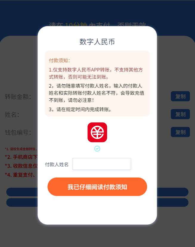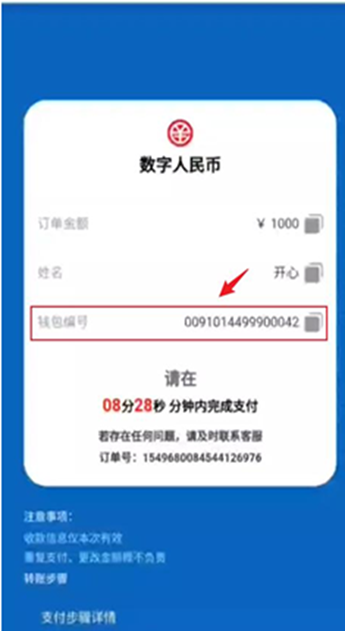 - Input payer name and and copy the Wallet Code then open the Digital Yuan App.