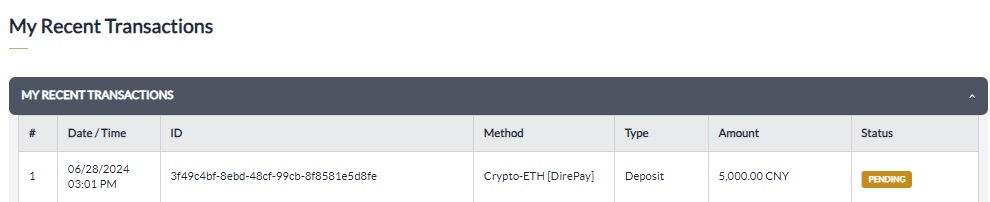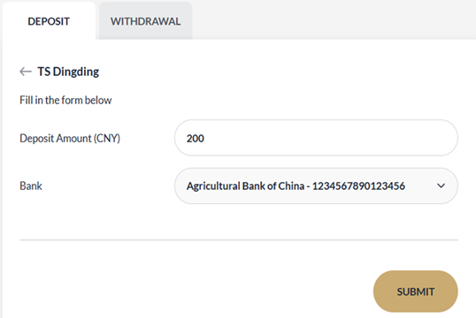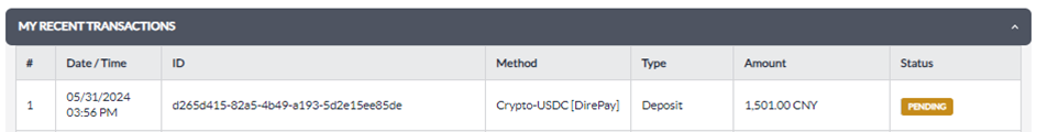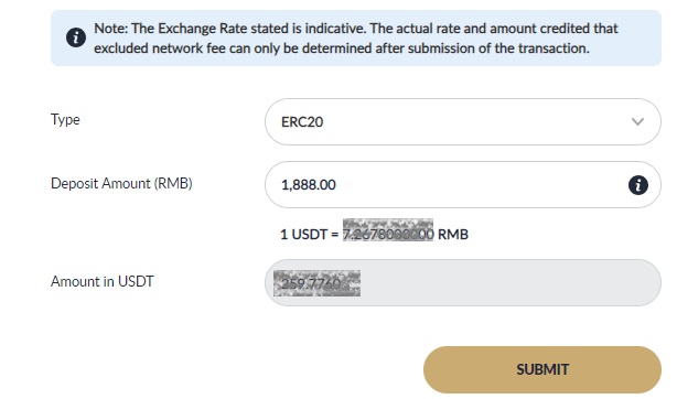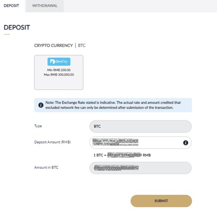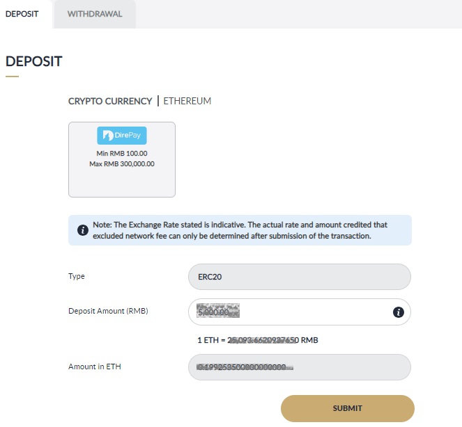 - Choose DirePay, Input Deposit Amount and click submit. Note: The exchange rate stated is indicative. The actual rate and amount credited can only be determined after submission of the transaction.