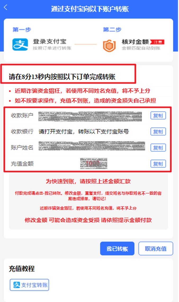- Follow on-screen instructions, complete within time limit, click【我已转账】