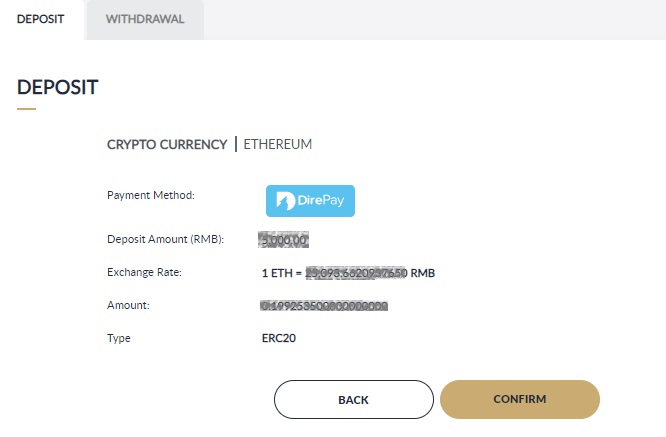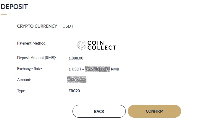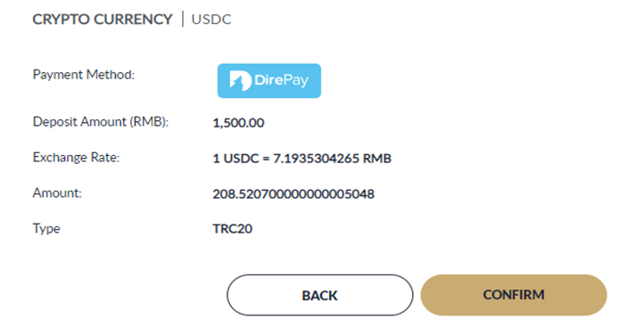 - Click Confirm to be redirected to crypto transaction page or click Back to change your deposit amount (Make sure to enable pop – up window) Note: The exchange rate stated is indicative. The actual rate and amount credited can only be determined after submission of the transaction.