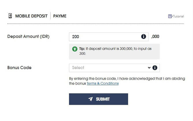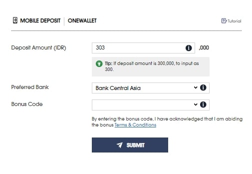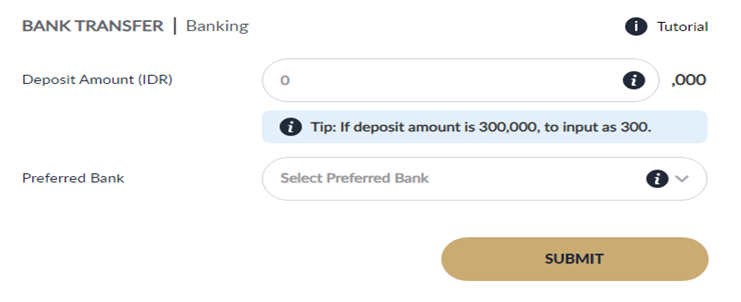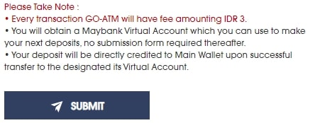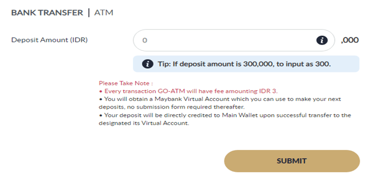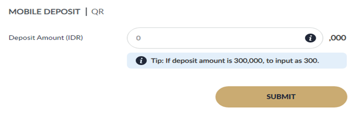 - Input the deposit amount → Choose preferred bank → Click "SUBMIT".
