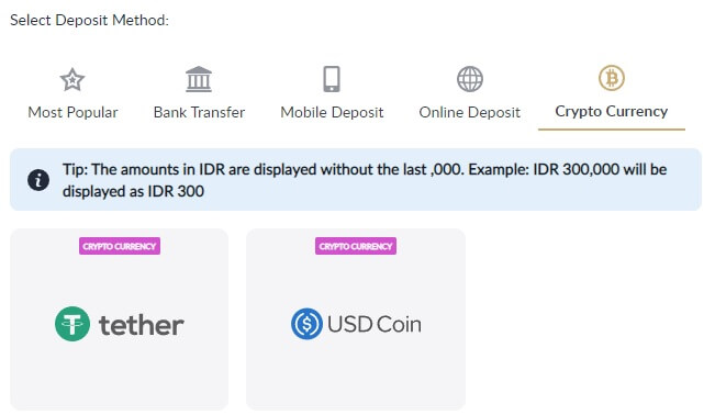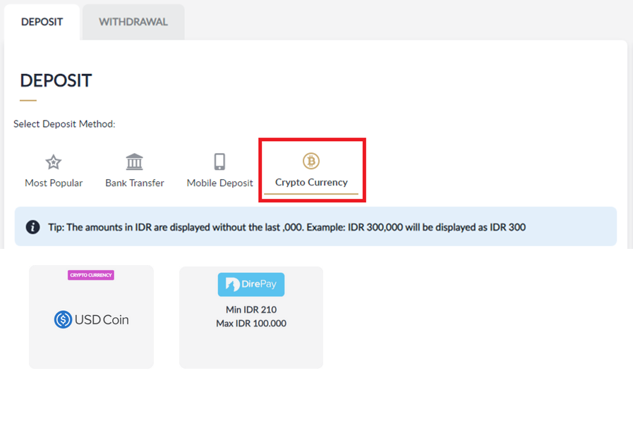 - Click "DEPOSIT" tab → Click "CRYPTO CURRENCY" → Click "USD COIN" → Choose "DIREPAY".