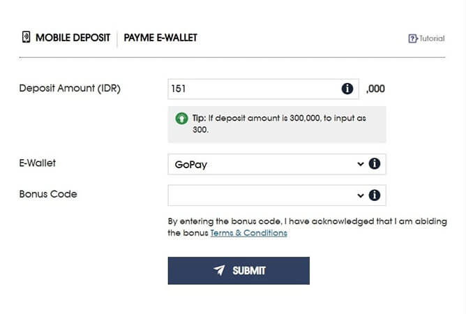 - Input "Deposit Amount" and choose preferred "E-Wallet" then click "Submit."