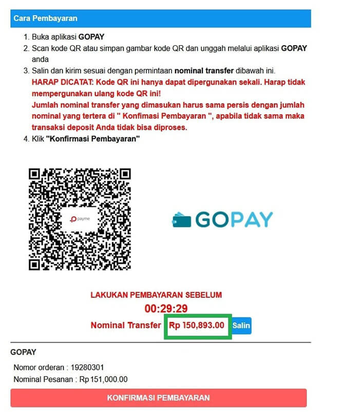 - A pop-up page will display; log in to your mobile banking app and scan the QR code through your QRIS. deposit the exact amount (including the last two digits) as specified on "Total Pembayaran," then click "KONFIRMASI PEMBAYARAN".