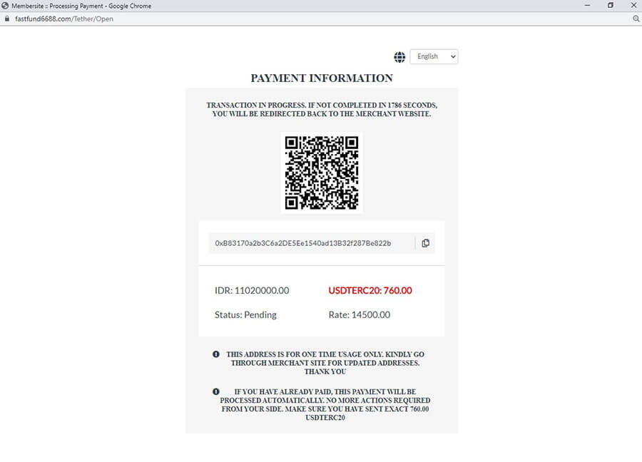 - You will be redirected to Crypto currency page. This page will show you the Address and Crypto amount (USDT ERC20) that you need to transfer excluding transaction fee (gas fee or miners fee).