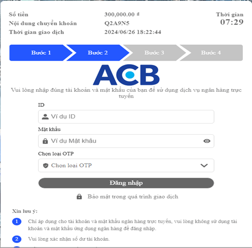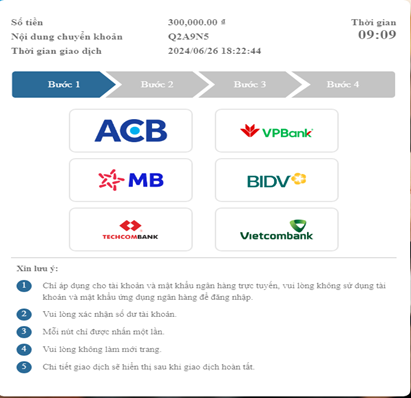 Bước tiếp theo vui lòng đăng nhập vào ngân hàng trực tuyến để thực hiện chuyển khoản. Lưu ý: Quý Khách cần nhập mã OTP do ngân hàng cung cấp qua tin nhắn để hoàn tất xác nhận giao dịch.