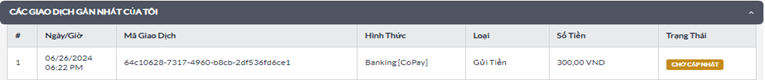 Vui lòng kiểm tra trạng thái và lịch sử gửi tiền của Quý Khách tại "CÁC GIAO DỊCH GẦN NHẤT CỦA TÔI"