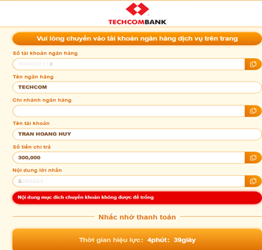 Thông tin tài khoản ngân hàng sẽ hiện ra, Bước tiếp theo vui lòng đăng nhập vào ngân hàng trực tuyến hoặc quét mã QR để thực hiện chuyển khoản. Lưu ý: Quý Khách cần nhập mã OTP do ngân hàng cung cấp qua tin nhắn để hoàn tất xác nhận giao dịch.