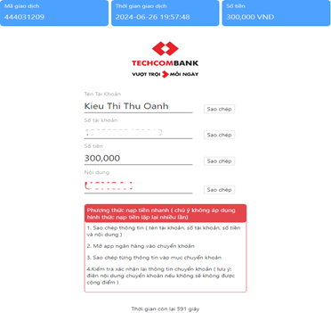 Thông tin tài khoản ngân hàng sẽ hiện ra, Bước tiếp theo vui lòng đăng nhập vào ngân hàng trực tuyến để thực hiện chuyển khoản. Lưu ý: Quý Khách cần nhập mã OTP do ngân hàng cung cấp qua tin nhắn để hoàn tất xác nhận giao dịch.