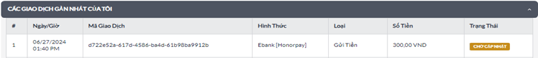 Vui lòng kiểm tra trạng thái và lịch sử gửi tiền của Quý Khách tại "CÁC GIAO DỊCH GẦN NHẤT CỦA TÔI"