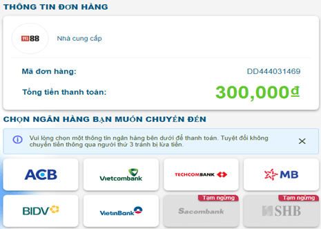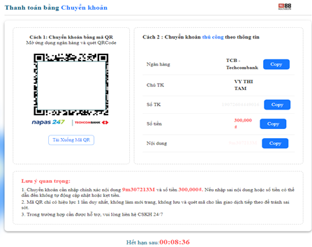 Thông tin tài khoản ngân hàng sẽ hiện ra, Bước tiếp theo vui lòng đăng nhập vào ngân hàng trực tuyến hoặc quét mã QR để thực hiện chuyển khoản. Lưu ý: Quý Khách cần nhập mã OTP do ngân hàng cung cấp qua tin nhắn để hoàn tất xác nhận giao dịch.