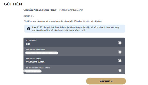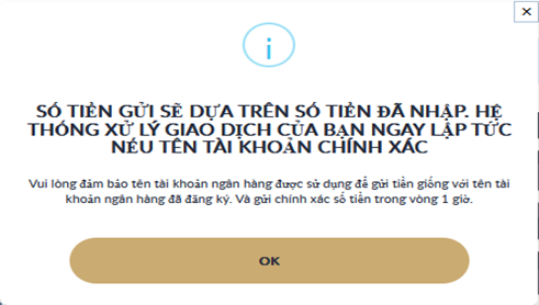 - Hệ thống sẽ cung cấp số tiền gửi gợi ý và Quý Khách chỉ cần nhấp "Ok" để xác nhận thông tin gửi tiền.
