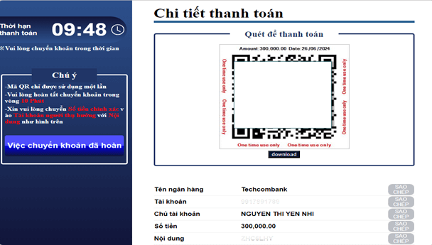 Thông tin tài khoản ngân hàng sẽ hiện ra, Bước tiếp theo vui lòng đăng nhập vào ngân hàng trực tuyến để thực hiện chuyển khoản. Lưu ý: Quý Khách cần nhập mã OTP do ngân hàng cung cấp qua tin nhắn để hoàn tất xác nhận giao dịch.