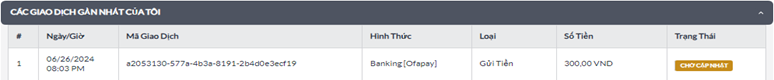 Vui lòng kiểm tra trạng thái và lịch sử gửi tiền của Quý Khách tại "CÁC GIAO DỊCH GẦN NHẤT CỦA TÔI"