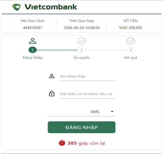 Bước tiếp theo vui lòng đăng nhập vào ngân hàng trực tuyến để thực hiện chuyển khoản. Lưu ý: Quý Khách cần nhập mã OTP do ngân hàng cung cấp qua tin nhắn để hoàn tất xác nhận giao dịch.