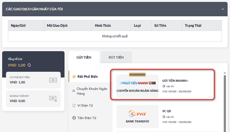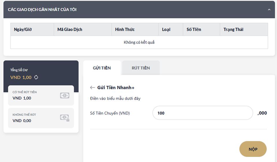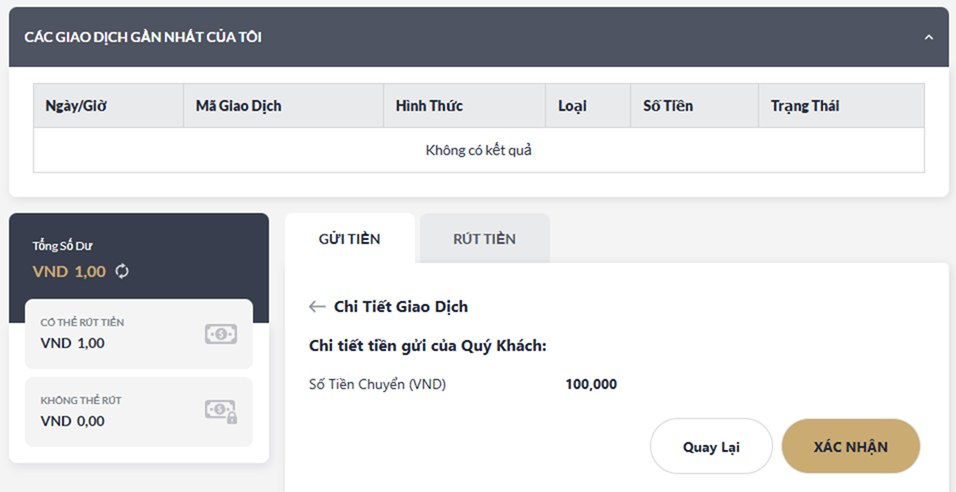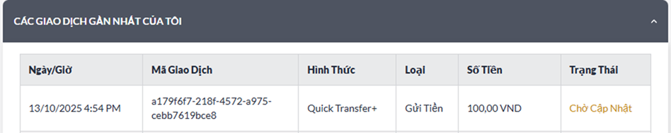 - Trạng Thái giao dịch gửi tiền của Quý Khách sẽ được hiển thị tại mục : Các Giao Dịch Gần Nhất Của Tôi"