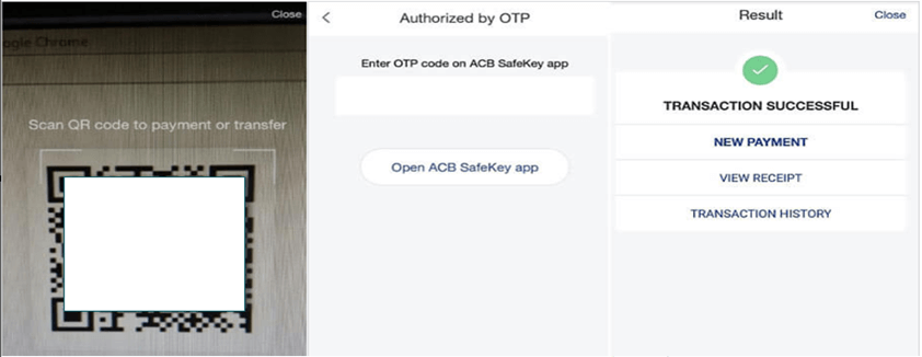 Đăng nhập vào Ứng Dụng Ngân Hàng Di Động và tiến hành quét mã QR. Lưu ý: vui lòng điền mã thấy tại mục "Nội dung điền:…" vào phần Nội Dung Chuyển Tiền trên phiếu gửi tiền của Quý Khách. Điền mã OTP để xác nhận giao dịch