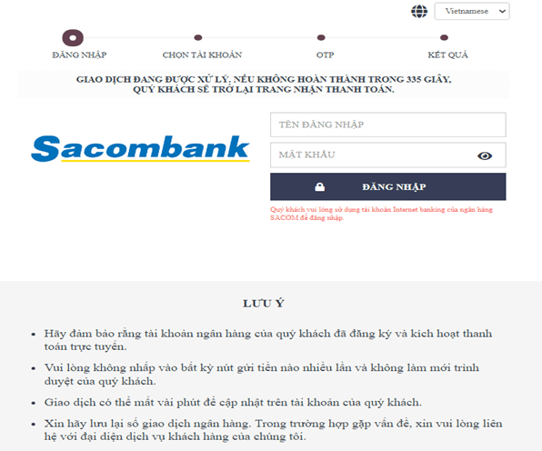 Bước tiếp theo vui lòng đăng nhập vào ngân hàng trực tuyến để thực hiện chuyển khoản. Lưu ý: Quý Khách cần nhập mã OTP do ngân hàng cung cấp qua tin nhắn để hoàn tất xác nhận giao dịch.