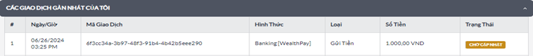 Vui lòng kiểm tra trạng thái và lịch sử gửi tiền của Quý Khách tại "CÁC GIAO DỊCH GẦN NHẤT CỦA TÔI"