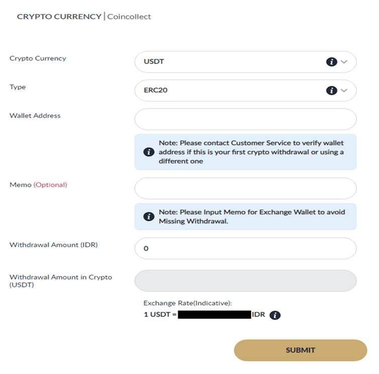 - Ensure to select the correct TYPE and WALLET ADDRESS. Take note of EXCHANGE RATE >> click SUBMIT to continue