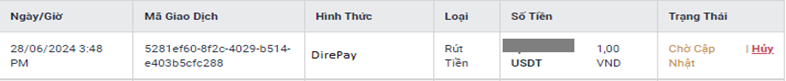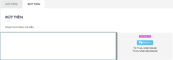 Chọn phương thức "DirePay" tại Rút Tiền.